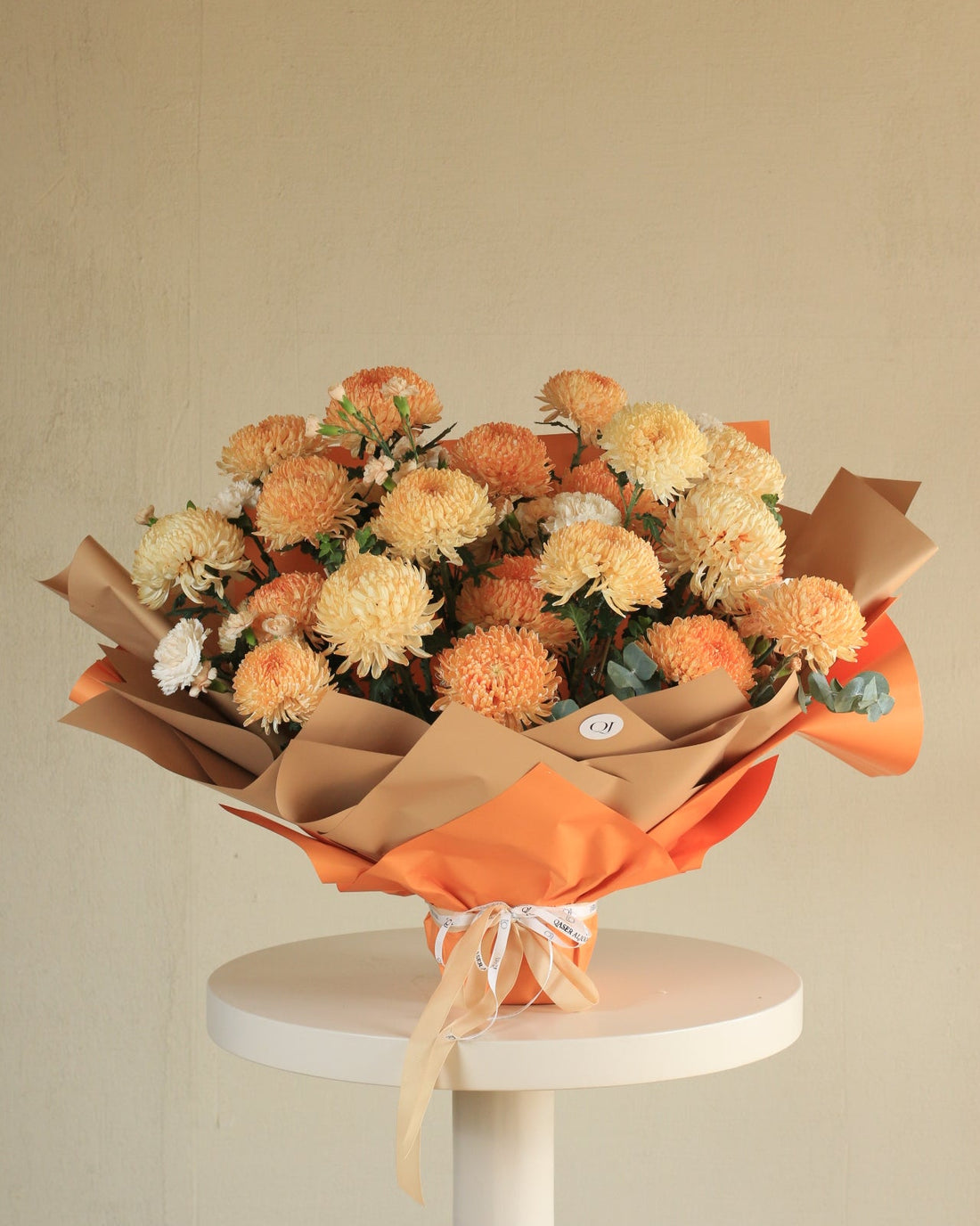 An elegant and luxurious bouquet, combining warm colors and exquisite details, featuring chrysanthemums in shades...