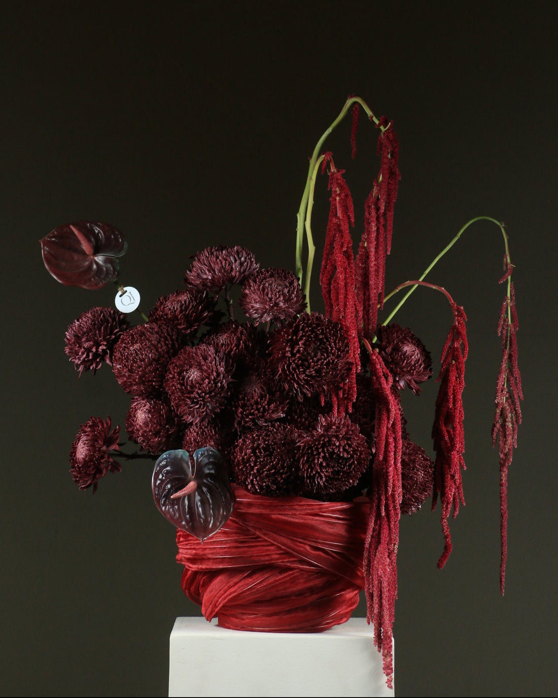 A luxurious bouquet exuding opulence and mystery, blending deep red and dark burgundy hues in...