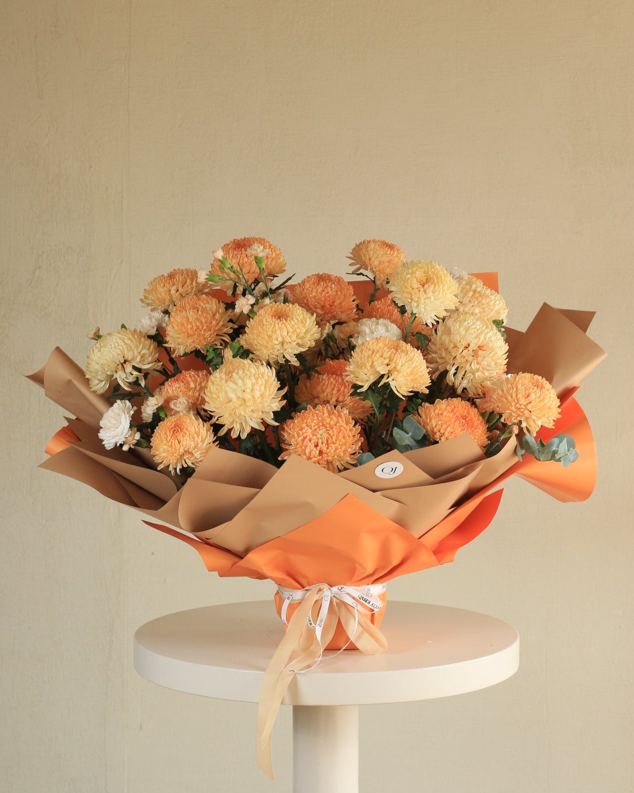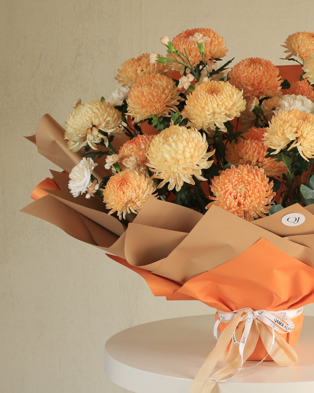 An elegant and luxurious bouquet, combining warm colors and exquisite details, featuring chrysanthemums in shades of apricot and beige to evoke a sense of tranquility and sophistication. Artfully wrapped in luxurious orange and light gold paper, and tied with an elegant silk ribbon.