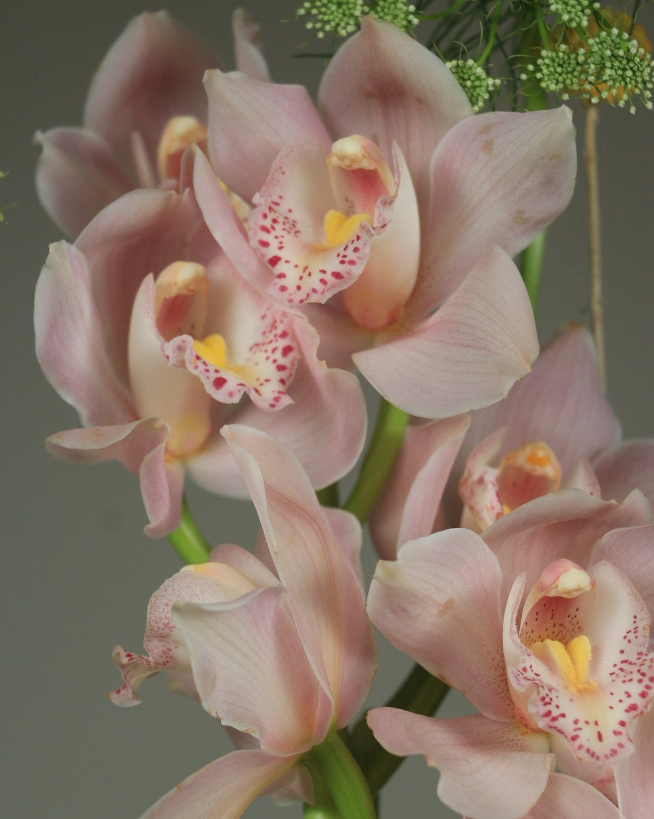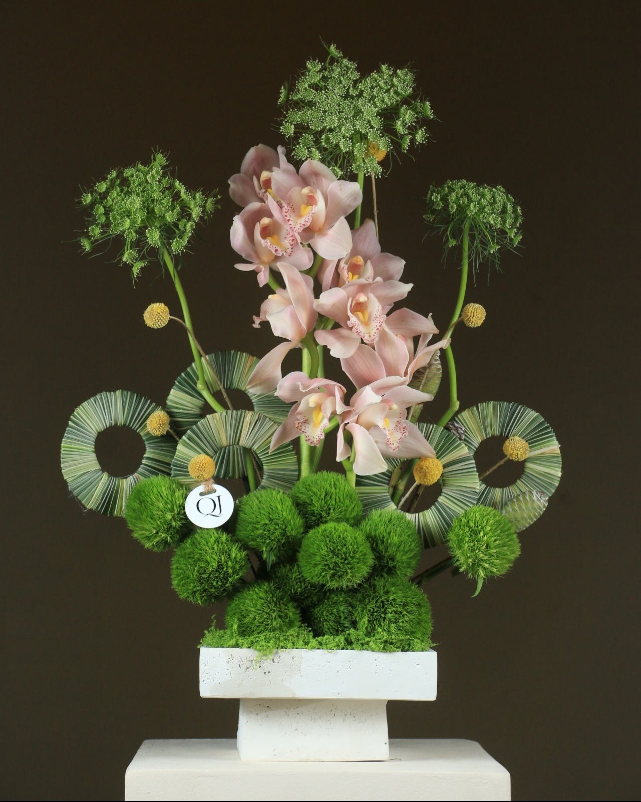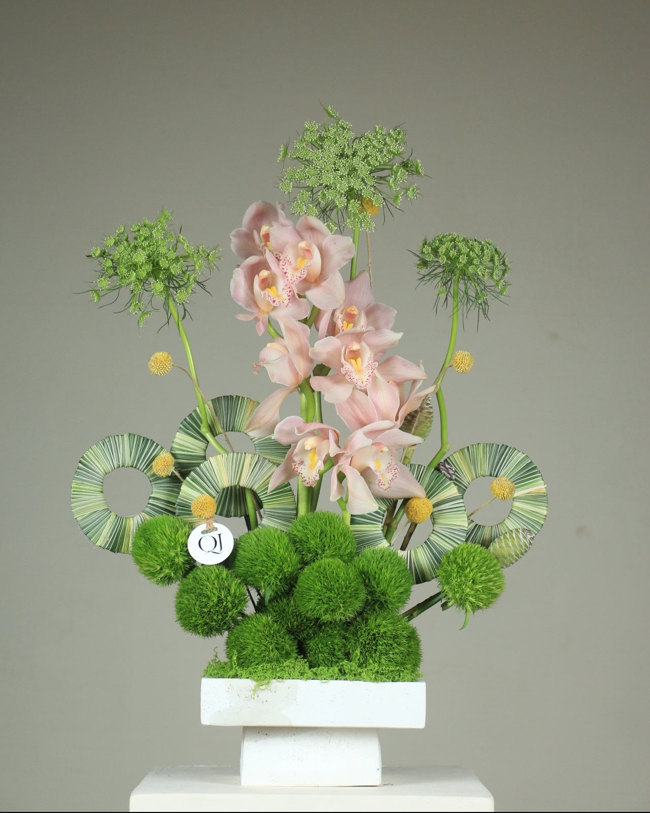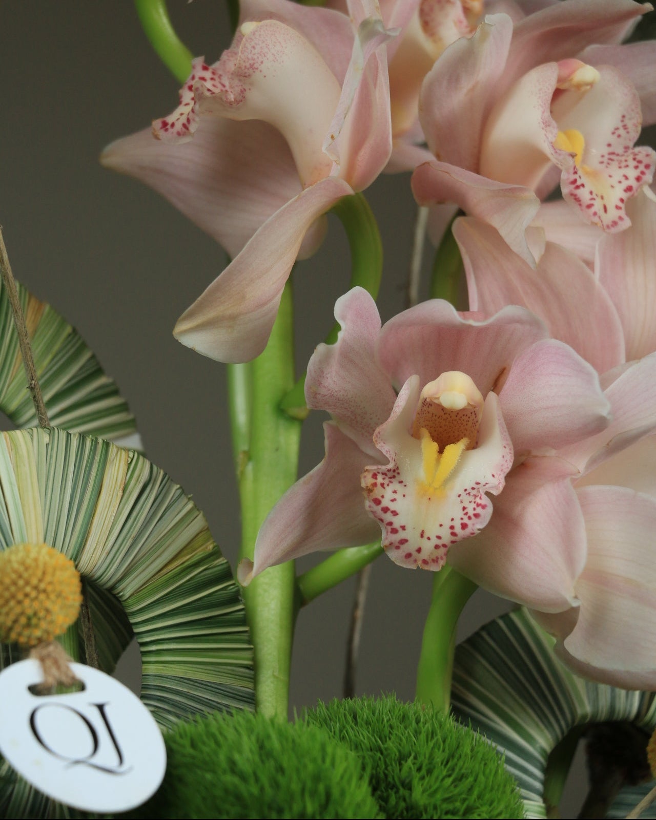 The vase shines with soft pink hues of luxurious orchids, harmonizing beautifully with lush green spheres and carefully arranged circular details of leaves, giving the arrangement visual depth and exceptional elegance.