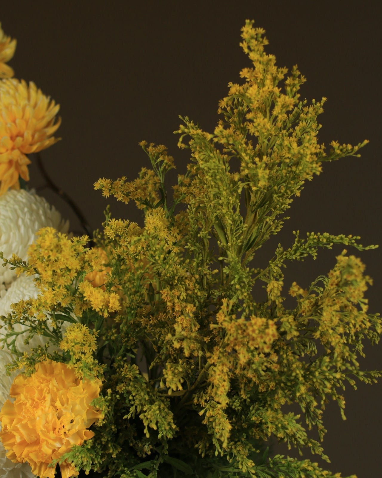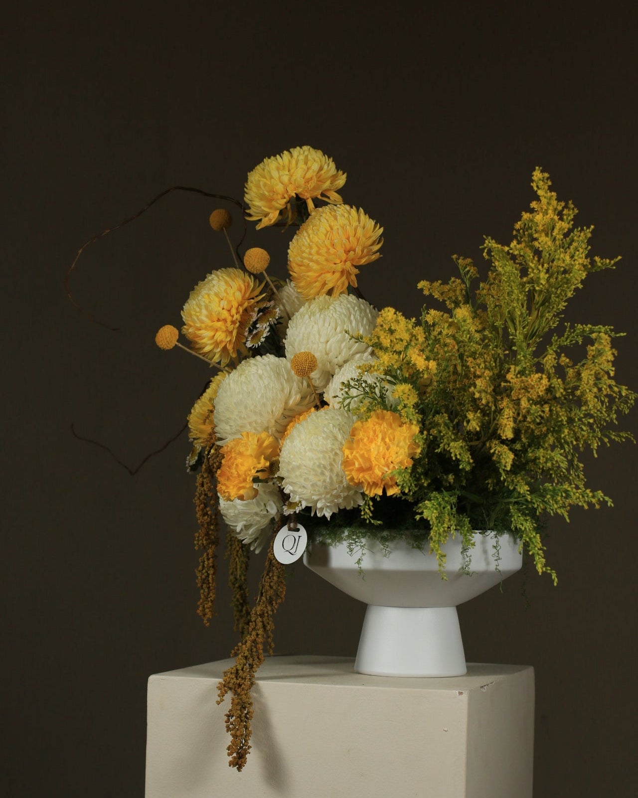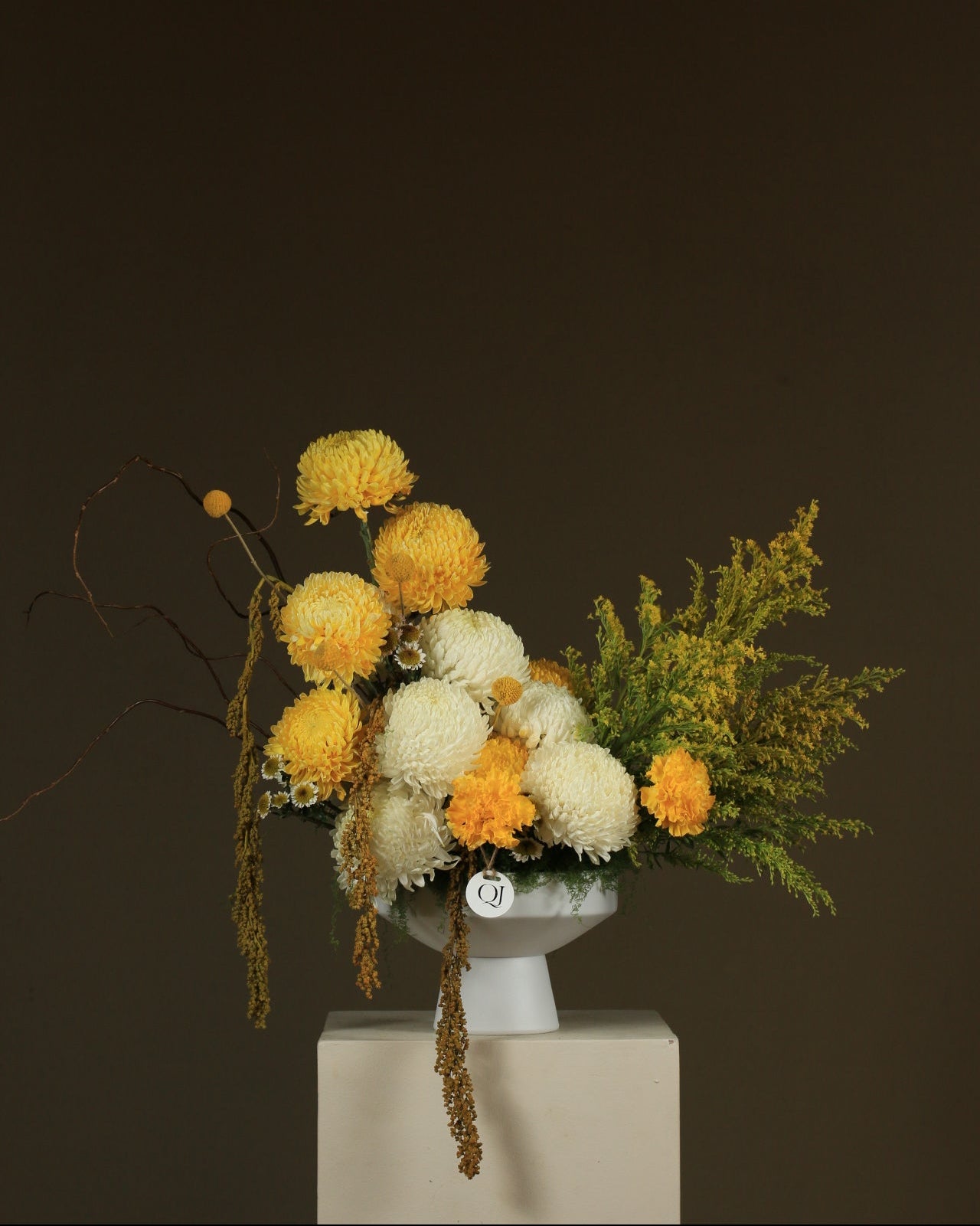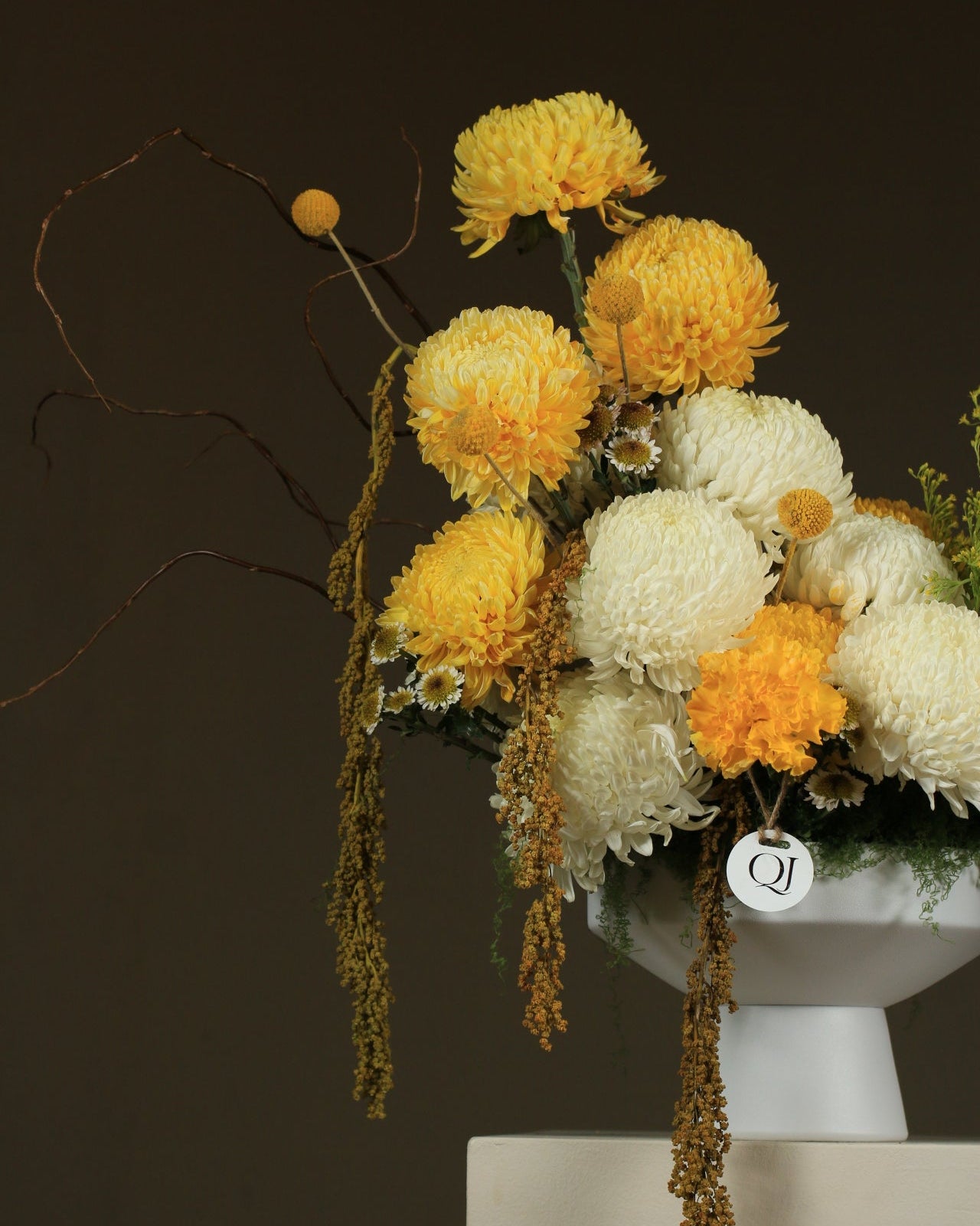 An elegant arrangement combining white and gold chrysanthemums with warm, natural touches, reflecting understated luxury perfect for sophisticated spaces and special occasions.