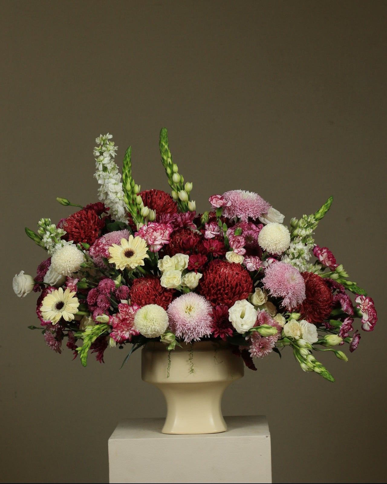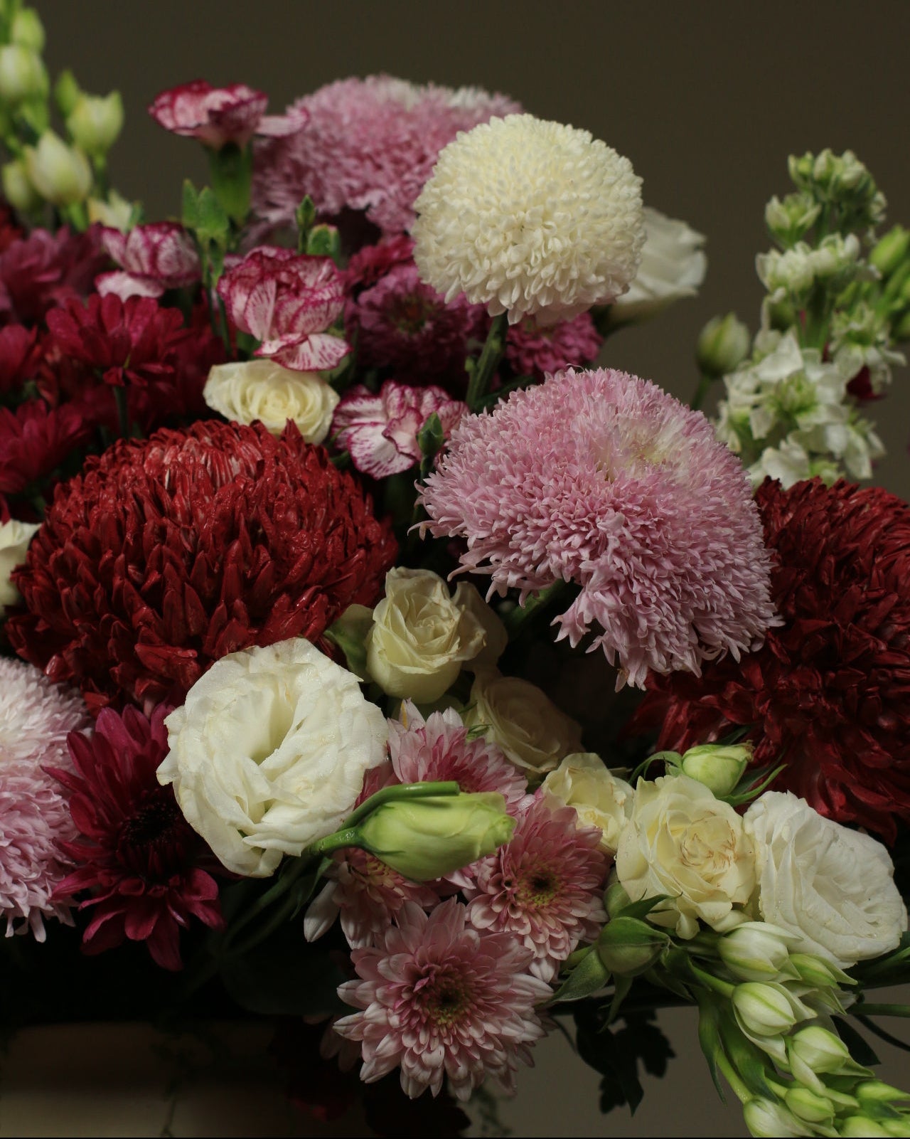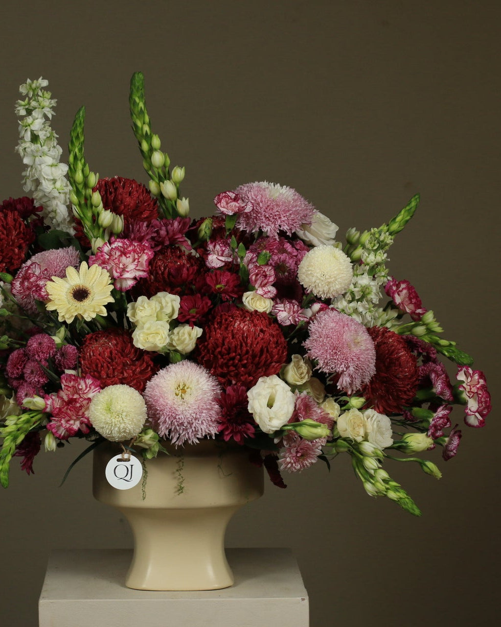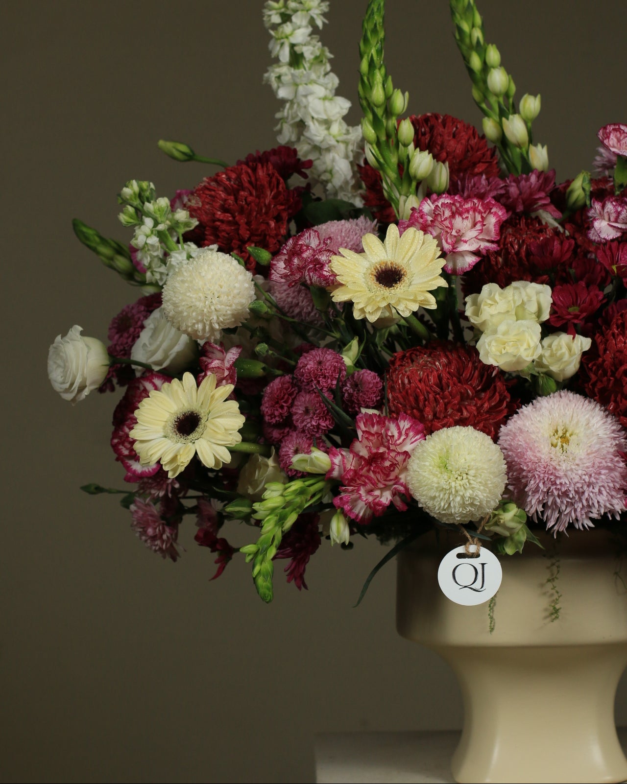 The Whispers of Velvet arrangement from QJ is a masterpiece of luxury and warmth, where deep burgundy hues blend with soft pink and subtle touches of ivory in an elegant and captivating harmony. Carefully selected flowers, with their rich details and velvety texture, are arranged with refined taste, reflecting sophisticated style and lending a distinctive presence to any space.