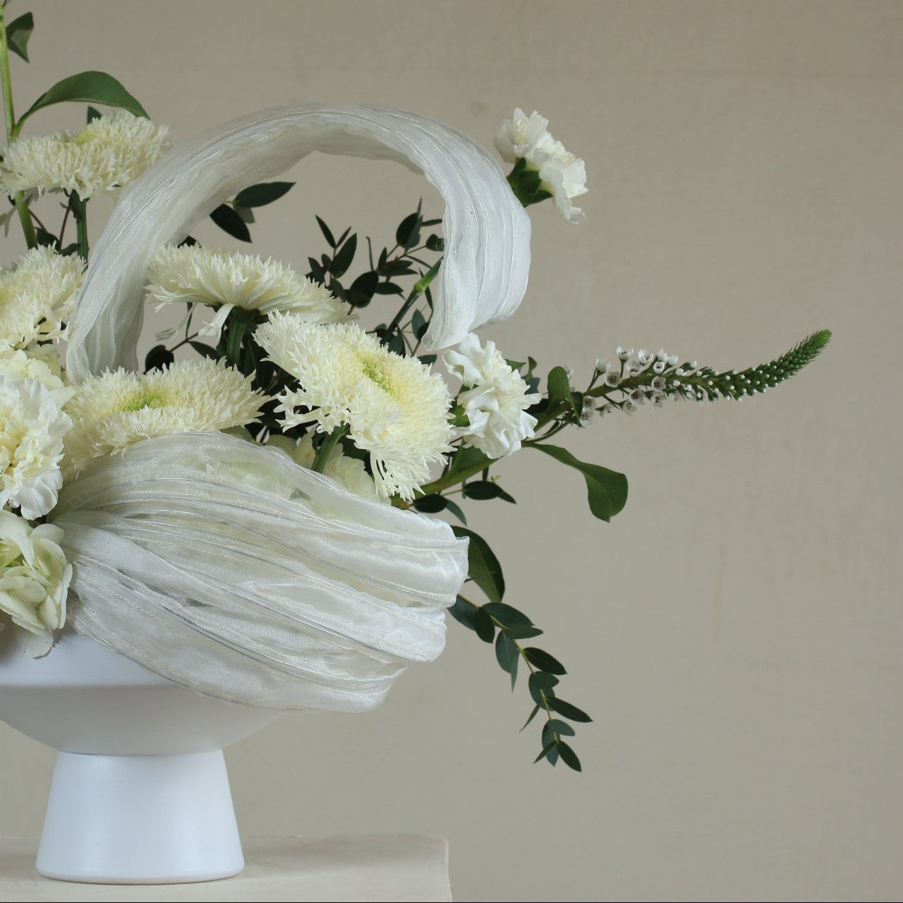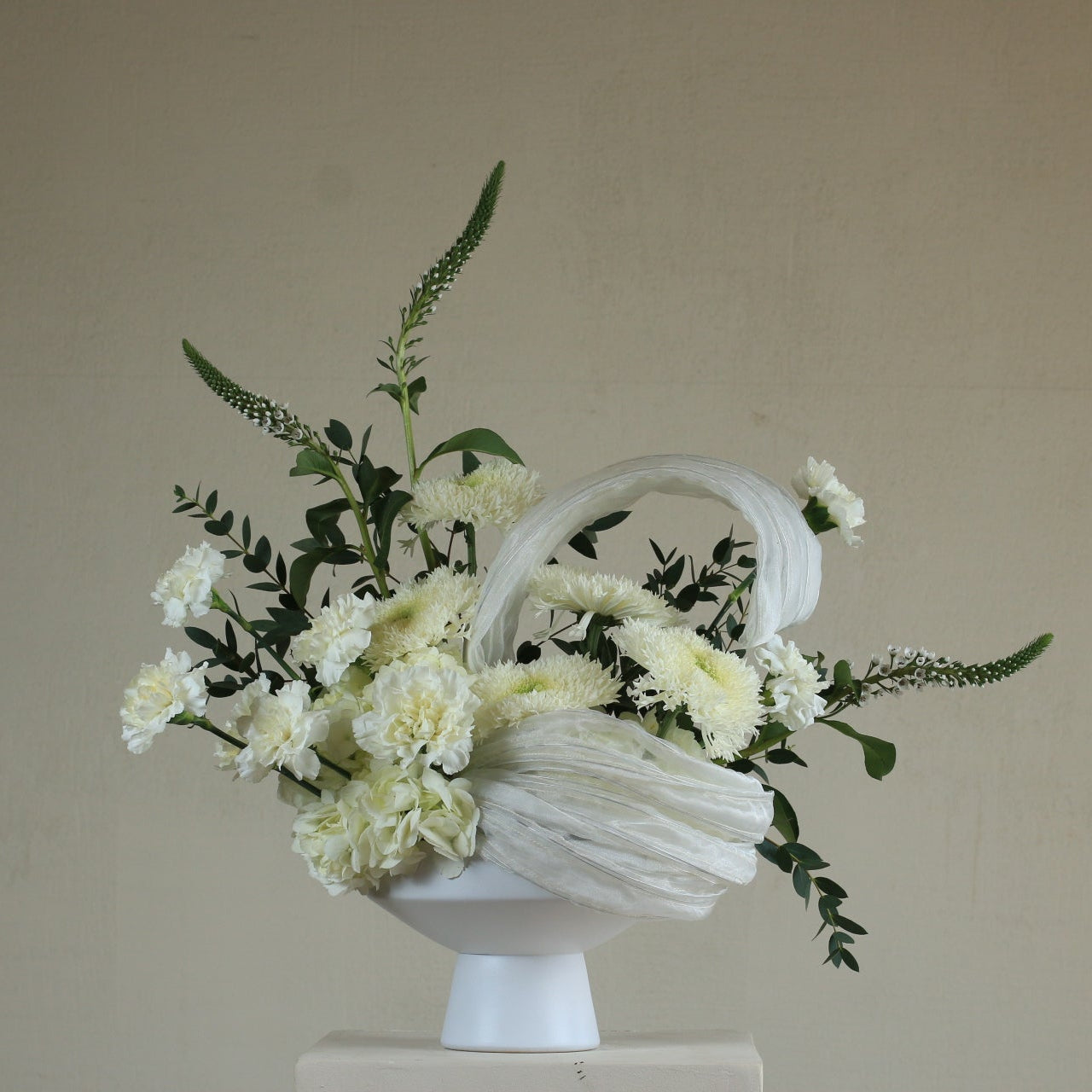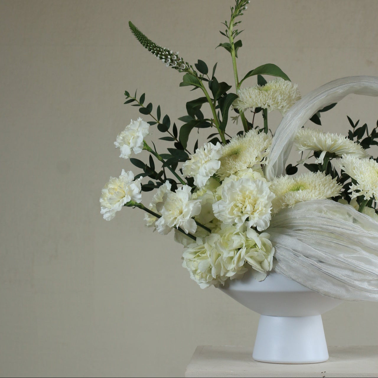 The "Whispers of White" bouquet embodies purity and sophistication at its finest. An elegant arrangement combines soft white flowers with natural green foliage in an artistic balance that evokes tranquility and peace. Perfect for decorating elegant occasions or as a gift that expresses purity and sincere feelings. Its modern and serene design makes it a work of art that adds a touch of luxury to any space. 🌿🤍